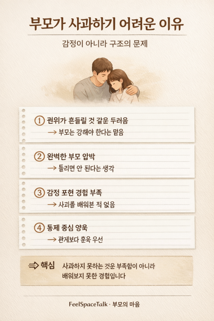 부모가 아이에게 사과하지 못하는 이유는 단순하지 않습니다. 부모는 늘 아이를 이끌고, 판단하고, 가르치는 위치에 서 있기 때문에, 사과는 그 위치를 잠시 내려놓는 경험처럼 느껴집니다.