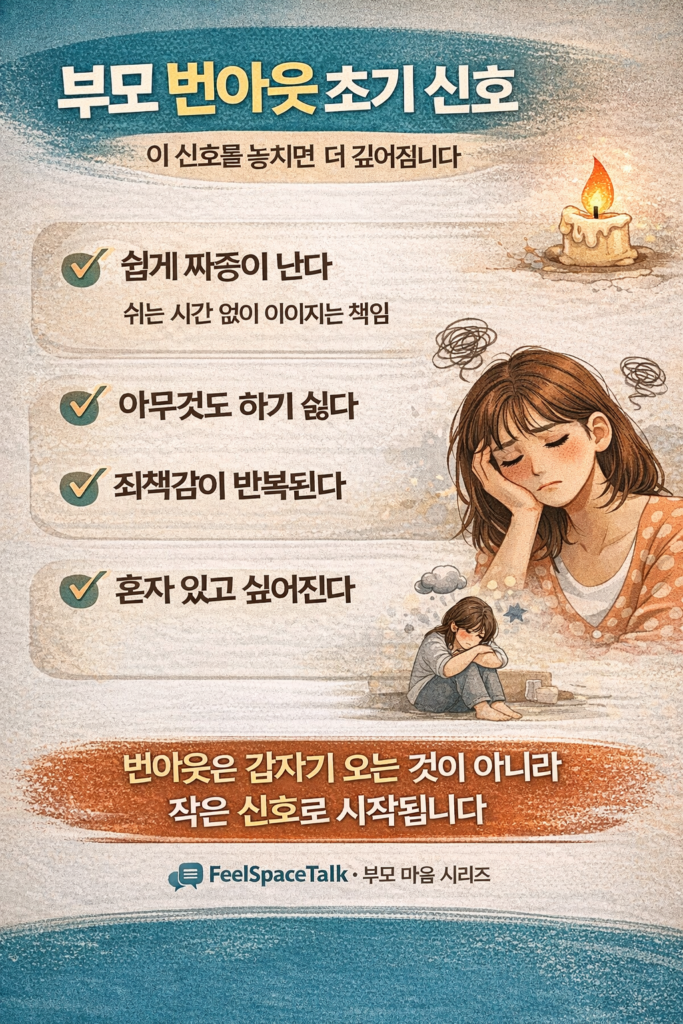 부모 번아웃은 갑자기 오는 것이 아니라, 작은 감정 신호들이 쌓이면서 시작됩니다.